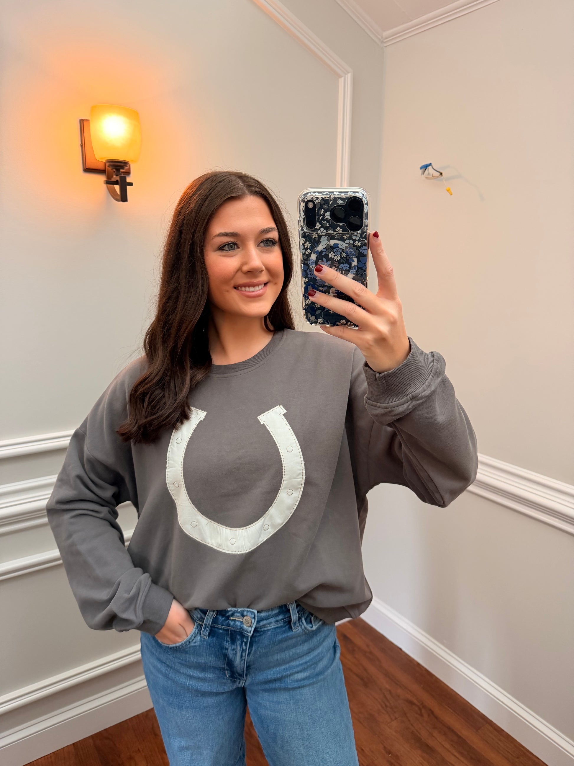 Our Lucky Horseshoe Pullover is crafted from a soft French terry blend that’s perfect for relaxed days and effortless layering. Featuring a bold horseshoe applique for that touch of rustic charm, this piece pairs perfectly with denim cutoffs, breezy skirts, or your favorite lounge pants.